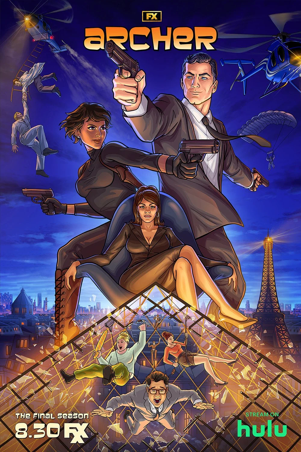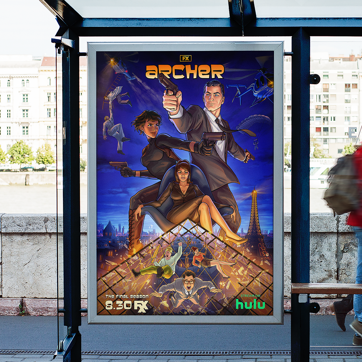 We teamed up with FX to create dramatic and action-packed promotional artwork, illustrating the series going out with a bang, literally. Playing off the tension between new character Zara and the titular Archer, we represented this clash of personalities and the chaos of Lana’s new leadership with shattering glass and characters caught in…precarious situations, to say the least.